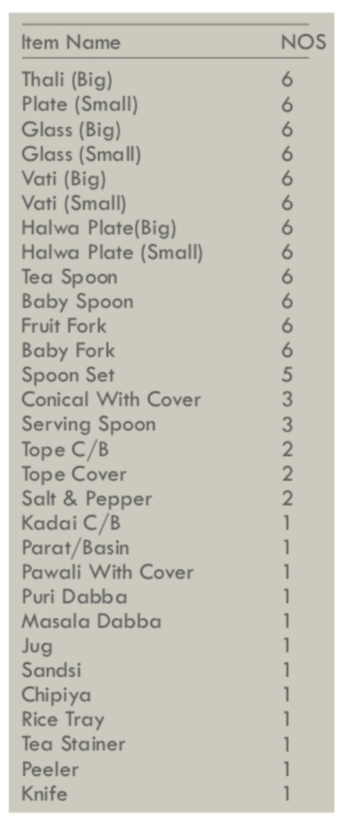 Make every meal special with the Bhartan Bhandar Wedding Set, a 101-piece premium stainless steel collection designed for a family of six. Whether it's a grand celebration or a cozy family dinner, this set ensures a seamless and elegant dining experience for all generations.