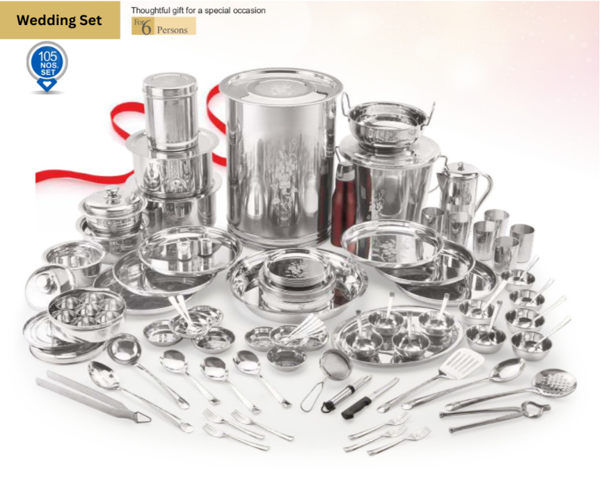 Make every meal special with the Bartan Bhandar Wedding Set, a 105-piece premium stainless steel collection designed for a family of six. Whether it's a grand celebration or a cozy family dinner, this set ensures a seamless and elegant dining experience for all generations.